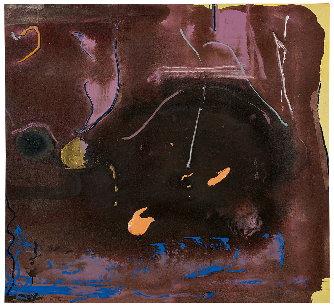 It was only after completing these intensive commitments that Frankenthaler returned to canvas in the spring of 1985. The impact of the break is palpable in Wellspring: the painting unfolds with a directness and spontaneity reminiscent of her works on paper. Against a pale yellow ground, a dark expanse in tones of brown and violet spreads across the surface. Drawn lines and splattered marks in gold, silver and orange seem to echo a graphic quality, while also demonstrating a renewed confidence in the handling of material.
